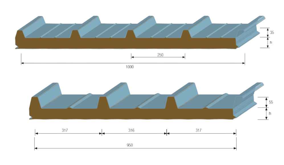 Итоговая толщина кровельных сэндвич-панелей обычно составляет от 50 мм до 300 мм, в зависимости от типа утеплителя и требуемых теплотехнических характеристик.
