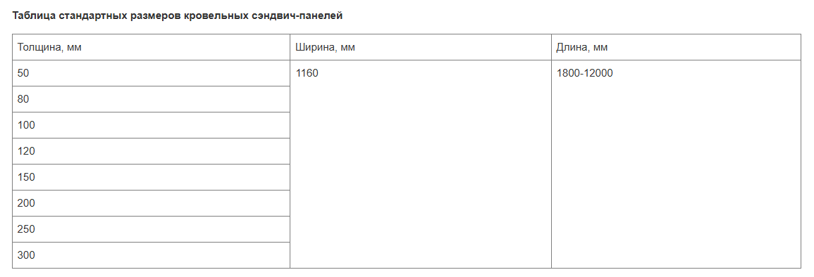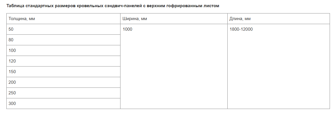 Основные размеры сэндвич-панелей для отделки кровель зданий в соответствии с нормативами ГОСТ 32603-2012 (Панели металлические трёхслойные с утеплителем из минеральной ваты. Технические условия):
