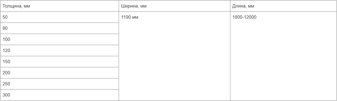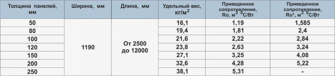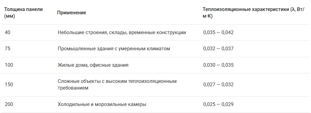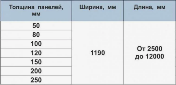 — 50 мм, 60 мм, 80 мм, 100 мм, 120 мм, 150 мм, 175 мм, 200 мм, 250 мм, 300 мм. В отдельных случаях могут быть доступны и панели толщиной 350-400 мм для экстремальных климатических условий или особых требований к энергоэффективности (например, холодильные камеры).