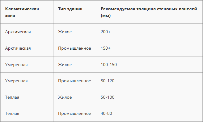 — Климатическая зона и требуемая теплоизоляция: Это основной фактор. Чем холоднее регион, тем толще должна быть панель для достижения необходимого коэффициента сопротивления теплопередаче (R-value или U-value). Разные типы утеплителя (минеральная вата, пенополиуретан (PUR), пенополиизоцианурат (PIR)) имеют разную теплопроводность, поэтому для одного и того же R-value могут потребоваться панели разной толщины, но с разными утеплителями. Например, панель с PIR-утеплителем толщиной 100 мм может обладать такими же теплоизоляционными свойствами, как панель с минеральной ватой толщиной 150 мм.